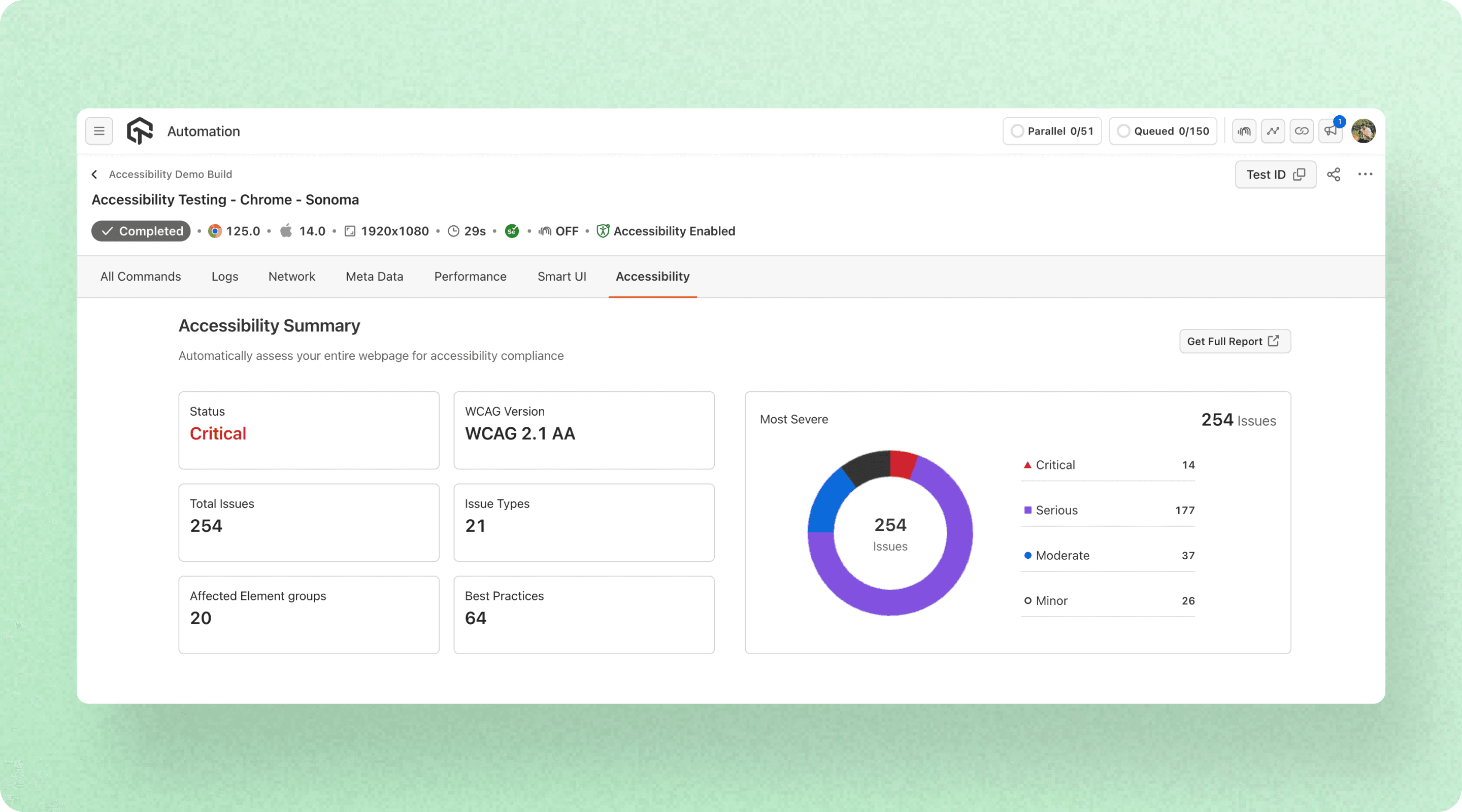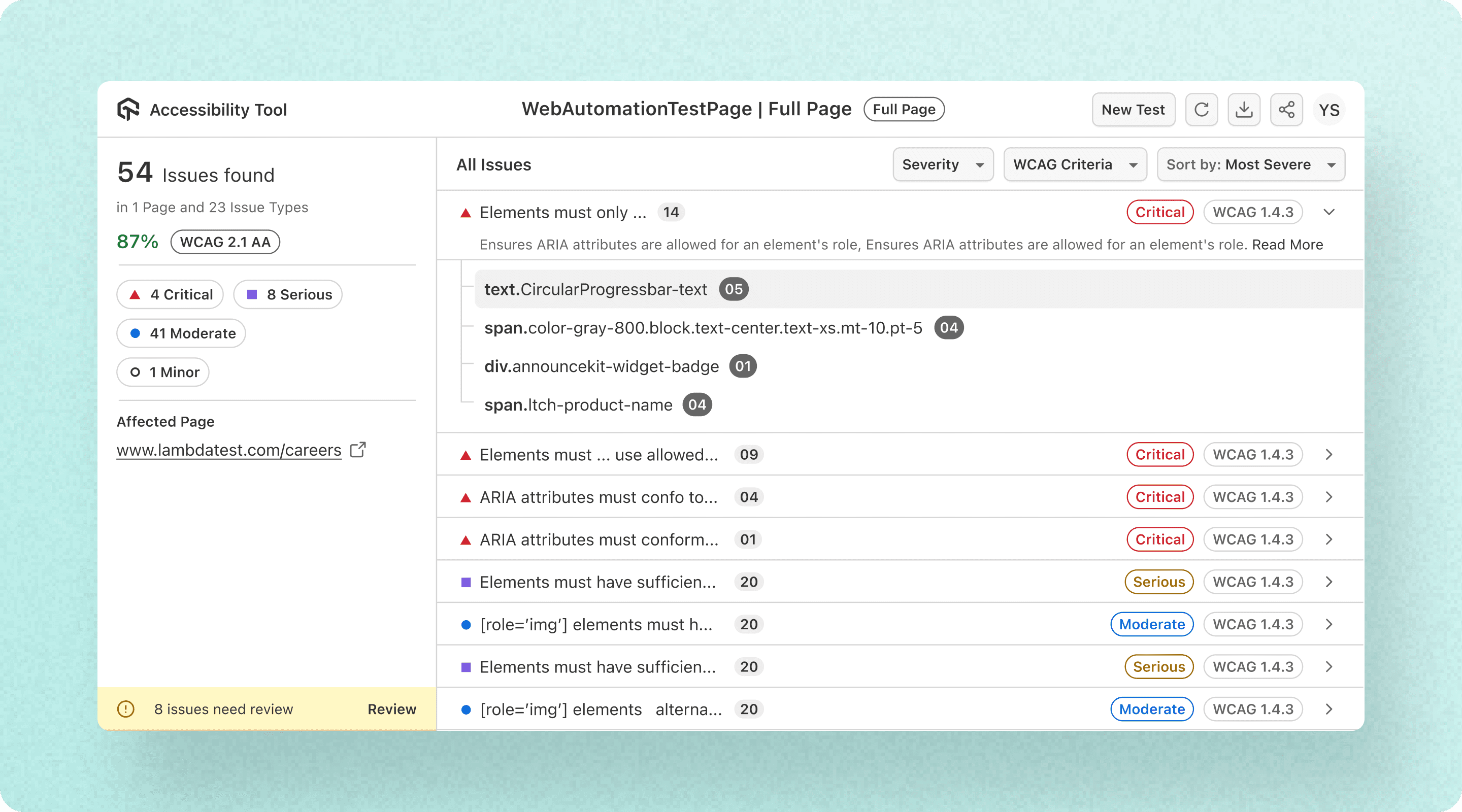 Integrate automated accessibility testing with DOM change detection, duplicate issue identification, and detailed WCAG compliance reports.